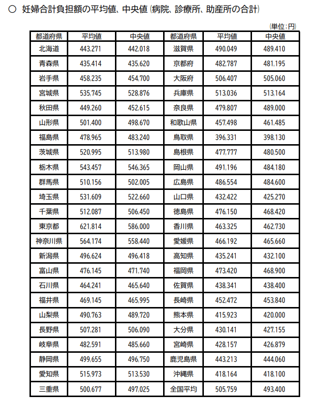 こちらも公益社団法人 国民健康保険中央会が公表している「出産費用の都道府県別平均値、中央値」を参考に、出産一時金42万円でまかなえる都道府県をご紹介します。