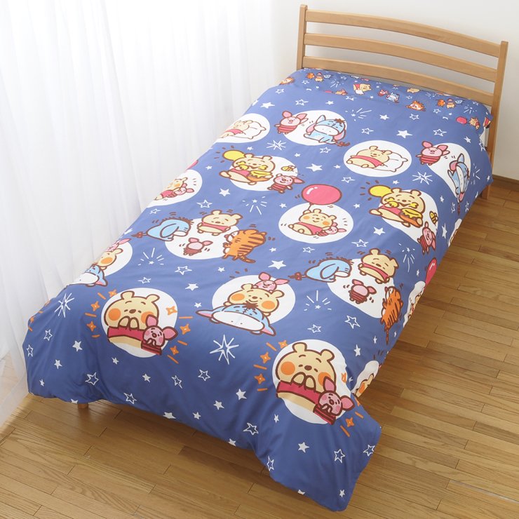 プーさんがピグレットとティガーとイーヨーと遊んでいるデザインがとても愛らしいですね。ネイビーの他に、サックスもあります。内緒話をしているような4人の姿や夜空を思わせるネイビーの色が素敵です。気持ちよさそうに眠っているプーさんの姿が、安眠効果がありそうですね。