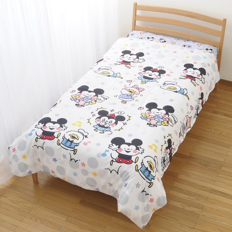プーさんのデザインのほかに、ミッキー・ミニー・ドナルド・デイジーデザインのものもあります。こちらも、楽しそうに遊ぶ4人の姿がかわいいです。こちらはグレーとブルーがあります。ぐってりとしているドナルドを見ていると、こちらも眠たくなります。寝具にぴったりなデザインですね。