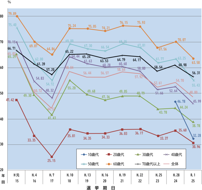 そうした中で、特に若者の間では、政治に関心が薄かったり、選挙以外にする事が多かったりして、選挙に行かない人も多いようで、若者の投票率は高齢者より大幅に低くなっています。