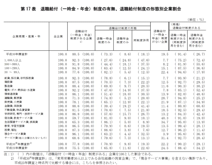 しかし、そもそも退職金がない人もいるでしょう。厚生労働省「平成30年就労条件総合調査」によれば、退職給付(一時金・年金)がある企業は8割程度。つまり、退職金がない企業も一定数あるのです。