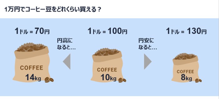 円高(1ドル=70円)になると、買えるコーヒー豆の量が増えますが、円安(1ドル=130円)になると、買える量は減ってしまいます。