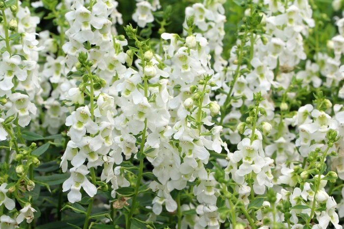 夏から秋まで咲き続けるアンゲロニア。高性種もありますが、寄せ植えには矮性種が向いています。花色はピンク、紫、青、白など。この組み合わせではイソトマとルリマツリの中間の高さにくるので、白花にすると抜け感が出ます。※参考価格:300円前後(3号ポット苗)