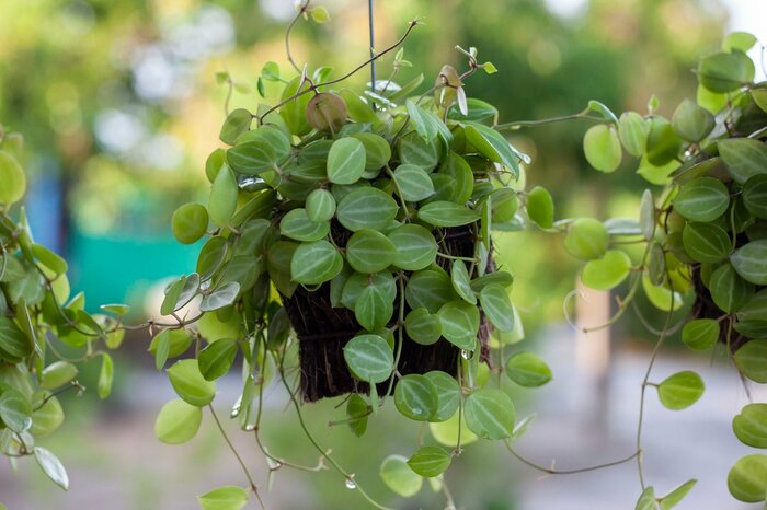 ディスキディアはぷっくりと分厚い葉が特徴のツル性植物。コインのような丸い形の「ヌンムラリア」や、ハート型の「ミリオンハート」が人気です。