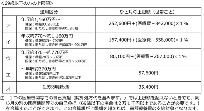 自己負担限度額は、年齢や所得で何段階かにわかれます。実際に69歳以下の金額を見てみましょう。