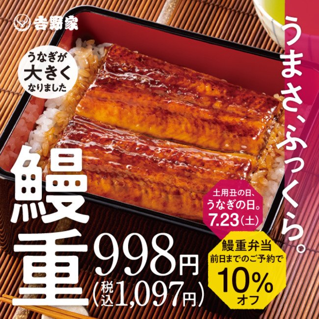株式会社吉野家は、土用の丑の日・7月23日に受け取りでテイクアウトの事前予約を注文した人に限り、「鰻重」「鰻皿」を会計時に税込価格から10%割引した価格で提供します。