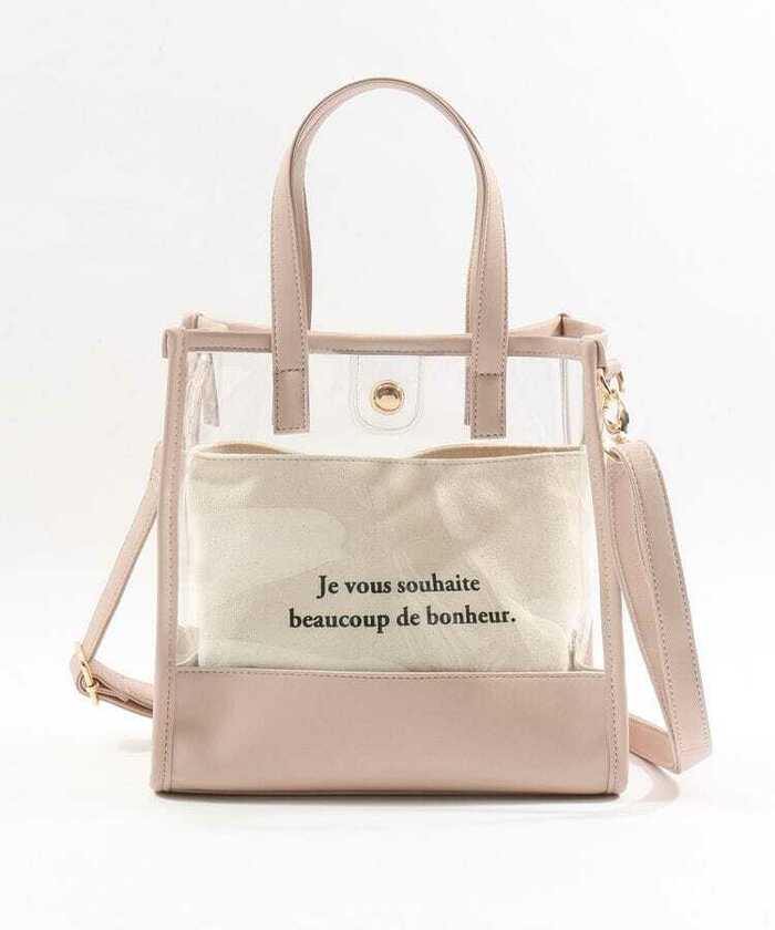 夏コーデにぴったりの涼しげなクリアバッグです。ショルダーバッグとしてもハンドバッグとしても使用可能な2WAY仕様。ピンク以外に、ブラック・ライトグレー・モカもあります。カラーバリエーションがかなり豊富なバッグです。お値段は2280円(税込)と、手に取りやすいのも嬉しいポイントといえるでしょう。
