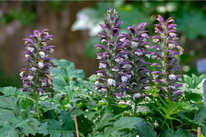 アカンサスは光沢のある葉とインパクトのある穂状の花が特徴。葉を大きく広げ、人の背丈ほども伸びる花姿がひときわ目を引きます。株張りが大きいので、十分なスペースが取れる場所に植えるのがオススメ。