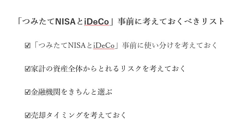 【チェックリスト付き】つみたてNISAとiDeCo、知らないと絶対後悔するポイント4選 2022.07.11 05:30 公開 執筆者浅沼 英樹 copy URL 目次[開く] 後悔1. 「つみたてNISAとiDeCo」使い分けをすればよかった 後悔2. 家計の資産全体からとれるリスクを考えればよかった 後悔3. 金融機関をきちんと選べばよかった 後悔4. 売却タイミングを考えておけばよかった 「つみたてNISAやiDeCo」始める前に考えておくべきことまとめ 参考資料 「つみたてNISAやiDeCo」始める前に考えておくべきことまとめ 出所:LIMO編集部作成 すべての画像を見る(1枚) つみたてNISAとiDeCoはいずれも魅力的な制度ではあります。 一方で、知らないと後悔する注意点もある商品です。「流行り」だけで始めるのではなく、事前にしっかり調べてご自身に合ったプランで始めると良いでしょう。 参考資料 金融庁「NISA・ジュニアNISA口座の利用状況に関する調査結果の公表について」 金融庁「つみたてNISAの概要」 iDeCo公式サイト「iDeCo(個人型確定拠出年金)の加入者数等について」 < 1 2 3 4 5 執筆者 浅沼 英樹 ファイナンシャルアドバイザー 防衛大学校、デザイン専門学校卒業後、大手ハウスメーカーを経て、2012年プルデンシャル生命保険株式会社に入社。8年間、個人営業に携わり卓越した営業成績を残す。営業管理職として採用や部下の育成に尽力し、社内研修ではパネラーに選抜される。社外セミナー講師経験あり。表彰歴多数、2015年度MDRT会員。その後、株式会社GA technologiesに入社、不動産営業を経験後、現在は個人向け資産運用のサポート業務に従事。住宅購入のアドバイスから老後の生活設計まで、人生にかかるお金の相談を強みとしている。証券外務員1種を保有。 関連タグ #つみたてNISA #iDeCo 注目コンテンツ 三大疾病に備える!人気の三大疾病保険を比較[PR] 退院後の通院治療に3000円。通院保障がつけられる医療保険はこれ![PR] 上皮内がんも対象になるがん保険。1番人気のがん保険は?[PR]