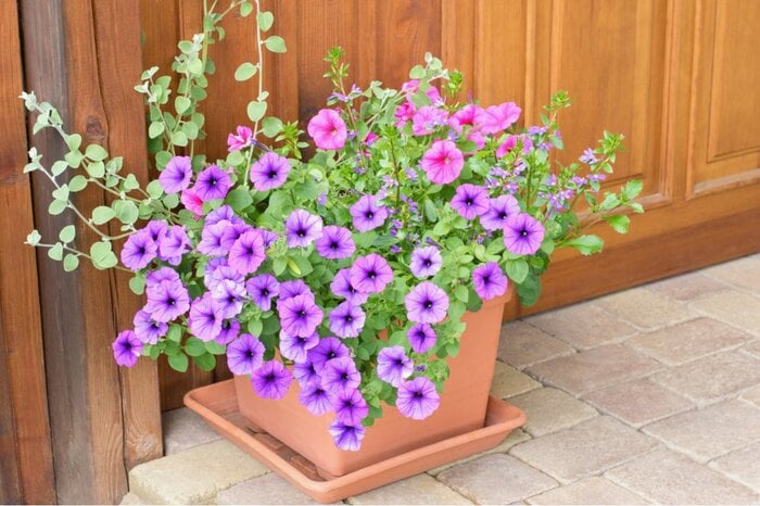 寄せ植えを作る際、1~2色の花色でまとめると見た目がスッキリします。白い斑入りの葉やカラーリーフを加えると華やかさがアップ。爽やかさを演出したいときは、ブルーの濃淡やブルーとホワイトの組み合わせがオススメです。