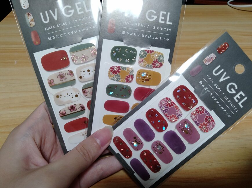 こちらがキャンドゥで購入できる和柄のジェルネイルシールです。2タイプ確認することができました。どれも和風なデザインと和の色が美しいですね。値段は100円です。