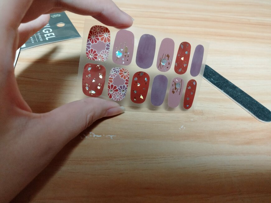 12枚入りのネイルシールシートと爪やすりのセットになっています。このアイテムだけで、ネイルを楽しむことが可能です。