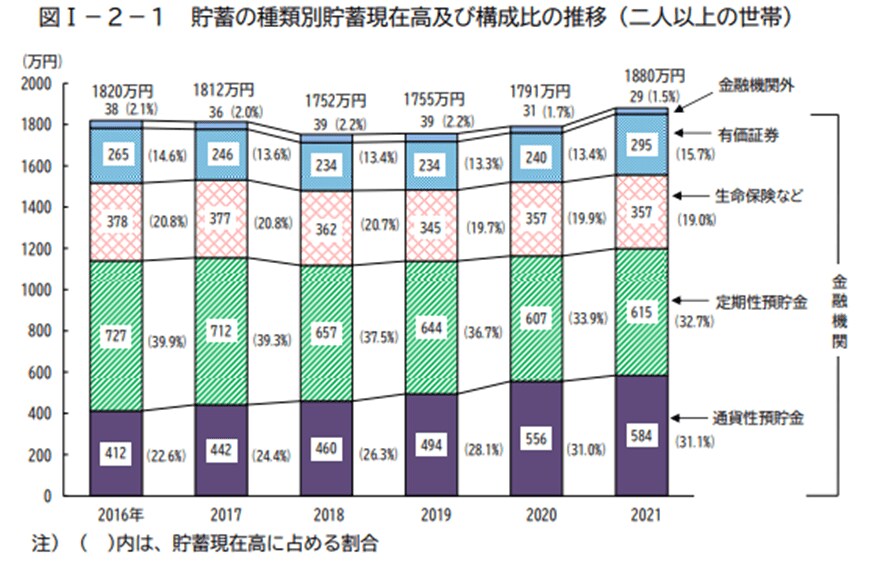 貯蓄の平均金額は1880万円ということですが、すべて預貯金で保有しているわけではありません。その内訳もみていきましょう。