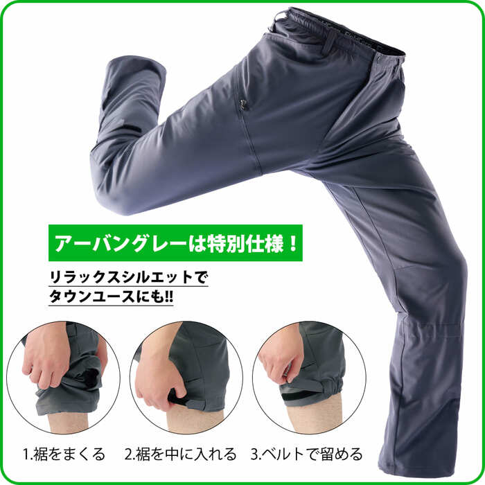今季は新色アーバングレーが仲間入り。RELAX STYLE(ゆったりシルエット)でタウンユースにぴったりのアーバングレーは、「1.裾をまくる 2.裾を中に入れる 3.ベルトで留める」 ことが出来る、クライミングアジャスター付きです。また、小物の収納に便利な背面にファスナーポケットがついています。右足のサコッシュや裾後ろにある反射材も便利ですね。