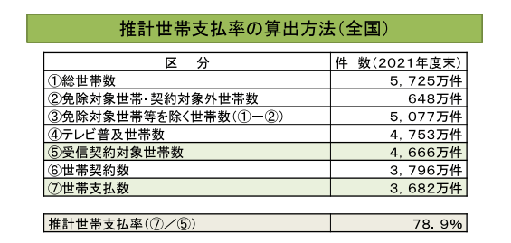 推計世帯支払率は、受信料を支払う対象世帯のうち、実際に支払をしている世帯の割合を示した数値。受信契約対象世帯数を分母、世帯支払数(世帯契約数ー世帯未収数)を分子として算出しています。