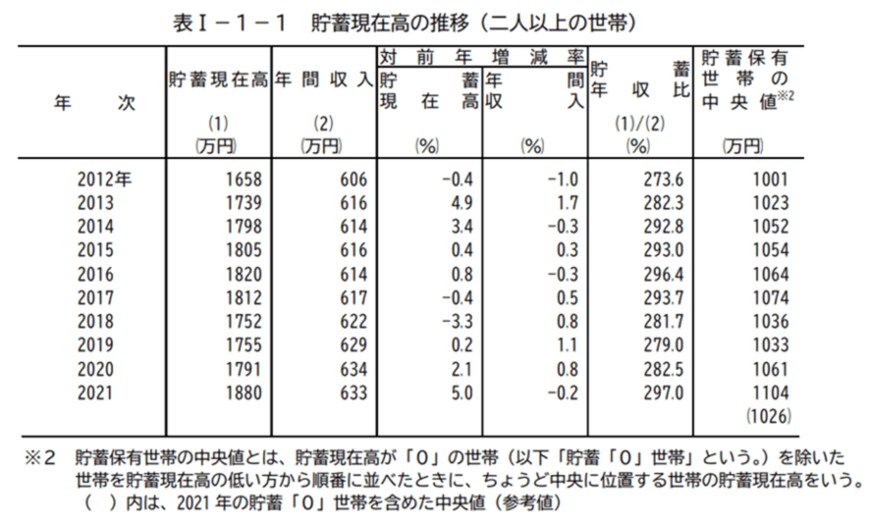二人以上世帯の貯蓄現在高は1880万円で、貯蓄保有世帯の中央値は1104万円となります。なお、年間収入は平均633万円となっています。