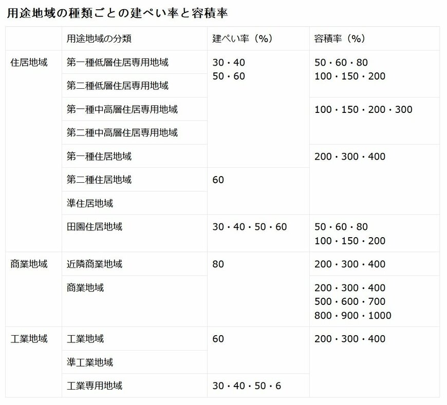 用途地域の種類による、建ぺい率と容積率の詳細は以下のとおりです。