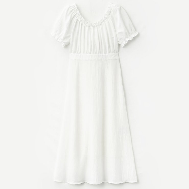 まずはこちら。胸元のギャザーがポイントのワンピースです。ほどよく開いたネック周りが、セクシーな雰囲気も出しています。値段は、1790円(税込 1969円)です。白以外に、ブラックもあります。