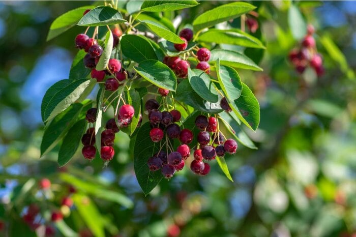 春は葉よりも先に白い花が咲き、緑の葉が茂る頃には赤紫のカワイイ実を鈴なりにつけます。6月に実がなるのでジューンベリーと名付けられました。