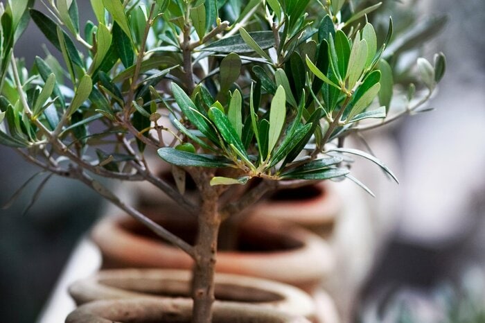 すらっとしたオリーブの苗木で高さを出して、秋まで楽しめる爽やかな寄せ植えの完成です。