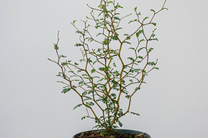 細い枝がジグザグに伸び、小さくて丸い葉が連なるユニークな樹形のソフォラ。株がしっかりすると夏にオレンジ色の花が楽しめます。