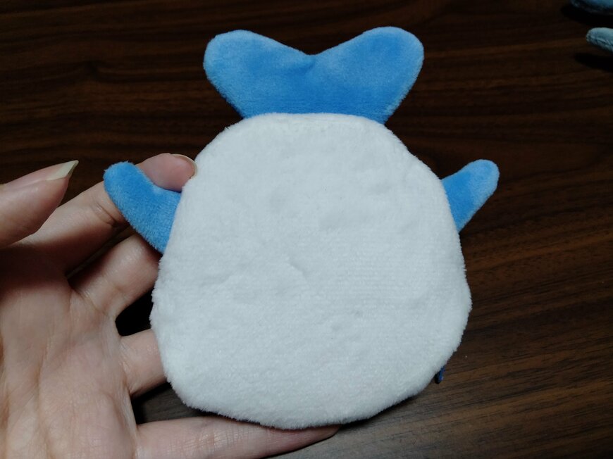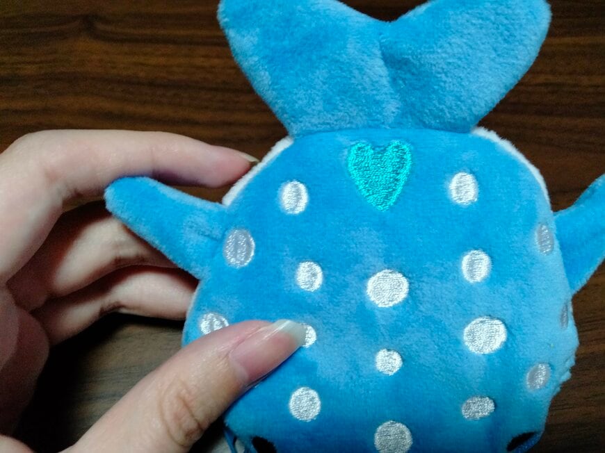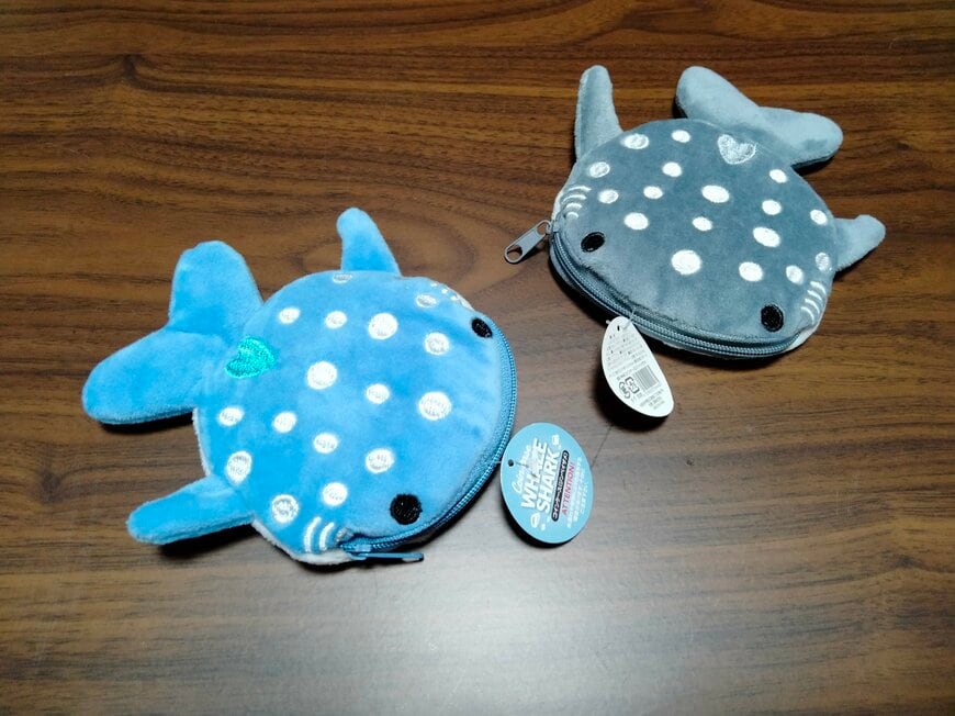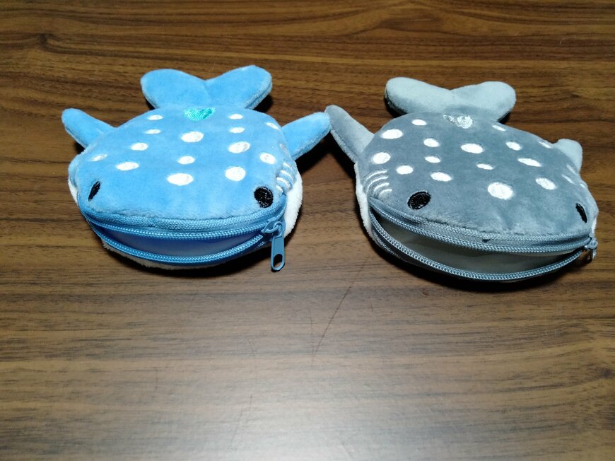 こちらがセリアで入手可能な、ジンベエザメのコインケースです。ブルーとグレーがあります。ブルーのほうがジンベエザメらしい感じがしますが、グレーのほうが実際のジンベエザメに近い色合いになっています。