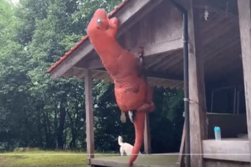 「懸垂する恐竜と無視する犬。」というツイートともに投稿されたのは、恐竜の着ぐるみを着た飼い主さんと犬の動画です。