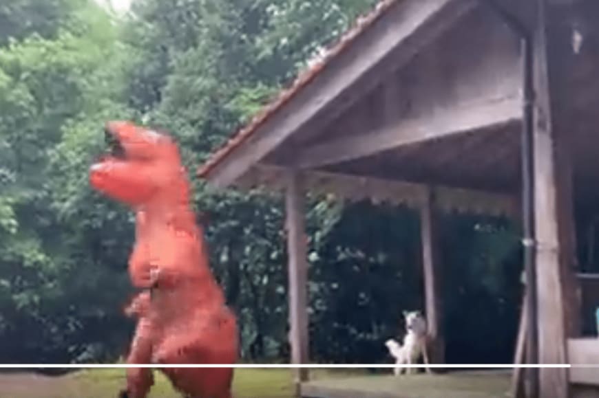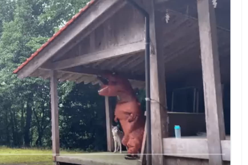 森林公園でしょうか、木々に囲まれたその場所に、恐竜の着ぐるみと犬が映っています。