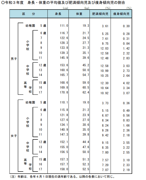 なお、肥満傾向児の割合は男女ともに小学校高学年が最も高く、特に男子は9歳以降1割を超えています。