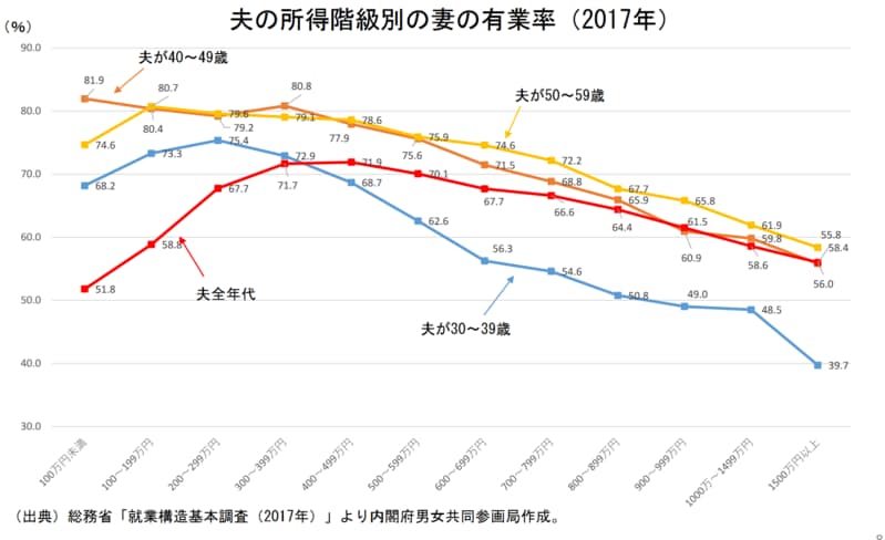 夫全年代で見ると、夫が「年収1000~1499万円」で58.6%、「年収1500万円以上」で56.0%の妻が働いています。