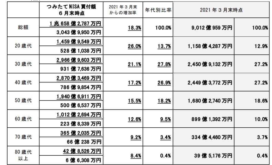 金融庁の資料より、つみたてNISAの年代別買付額を2021年3月末から6月末時点の増加率で見ると、最も増えたのは「20歳代(26.0%)」「30歳代(21.1%)」「40歳代(17.2%)」。