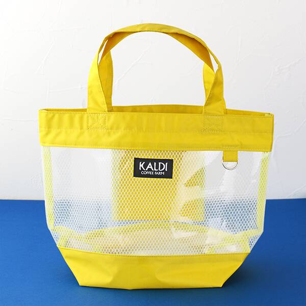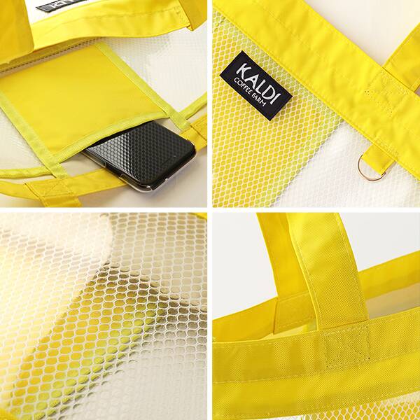 バッグは夏らしい網目模様入りのビニール素材のバッグで一部にクリア素材を使用。イエローとダークグリーンの2色を展開しています。内ポケットやキーホルダーなどを付けられるDカンなど、使い勝手にもこだわっています。