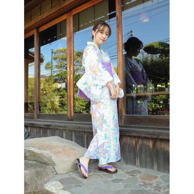 ホワイトカラーが涼しげな浴衣です。クレマチスの花が描かれています。少し個性的な印象を与える浴衣です。