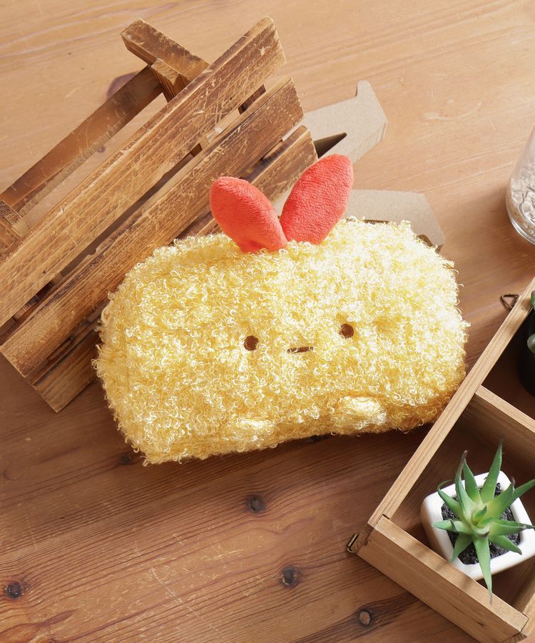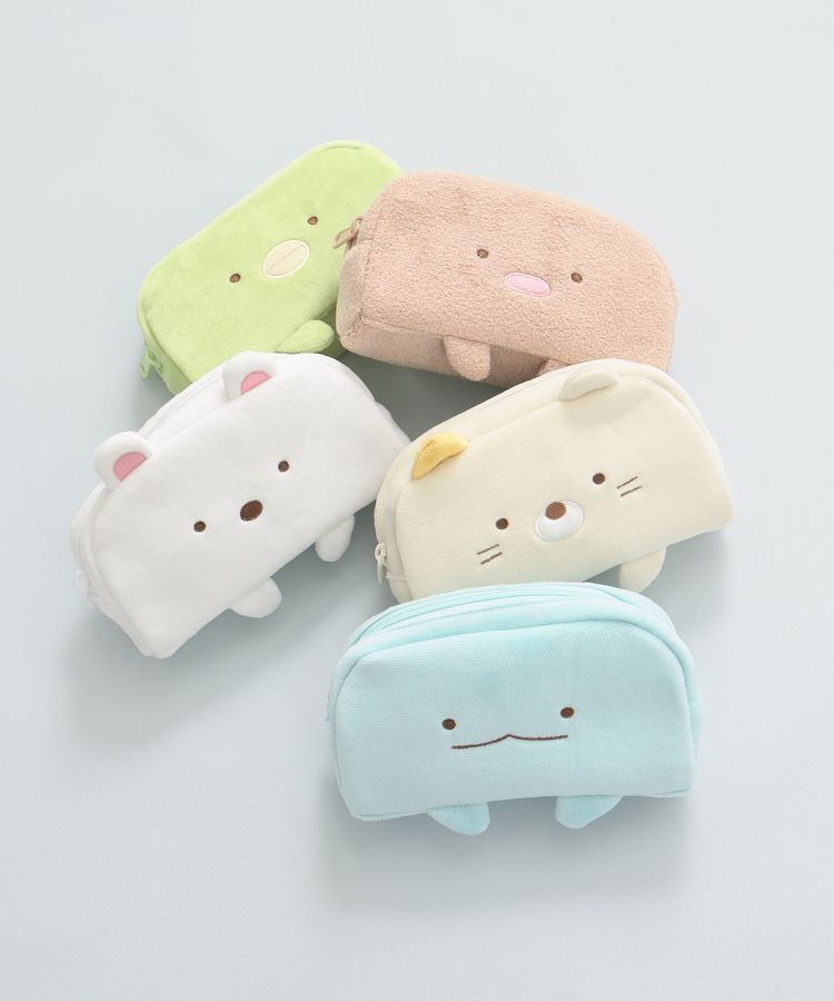 こちらがすみっコぐらしポーチです。上画像の、しろくま・とかげ・ねこ・ぺんぎん・とんかつにプラスして、下画像のえびふらいのしっぽがいます。