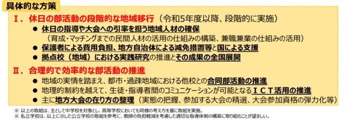 また、地域によっては平日の部活動についても更なる地域移行を進めていくとしています。これまで勝利主義に傾きがちな大会運営の見直しも含んでおり、部活動を巡る一大転機となる改革です。