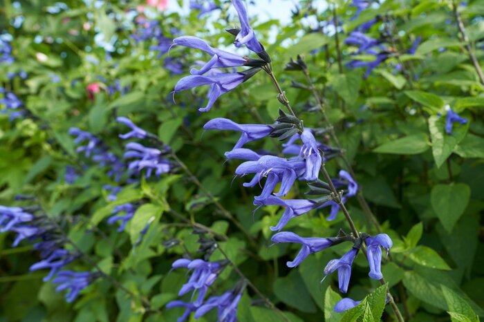 一年草から多年草までさまざまな品種が揃うサルビア。スッと伸びる穂状の花がエキナセアの丸い花とうまく調和します。ブルー系の花色だと夏の庭が涼やかに。