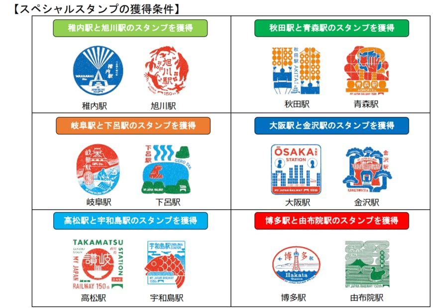 「稚内駅と旭川駅」「秋田駅と青森駅」「岐阜駅と下呂駅」「大阪駅と金沢駅」「高松駅と宇和島駅」「博多駅と由布院駅」それぞれのスタンプを獲得することでスペシャルスタンプを手に入れることができます。