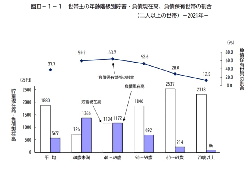 - 40歳未満:貯蓄726万円・負債1366万