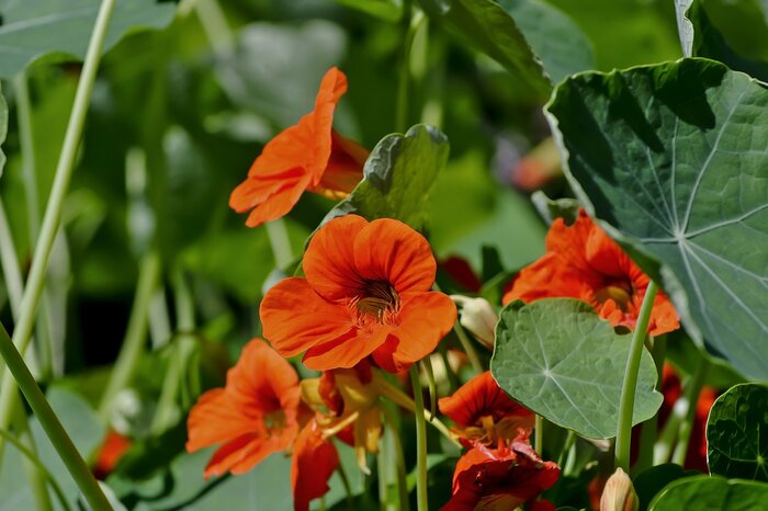 ハスに似た丸い葉とオレンジやイエローの花がオシャレなナスタチウム。別名「金蓮花(キンレンカ)」とも呼ばれ、病害虫を防ぐコンパニオンプランツとして、他の植物とよく混植されています。