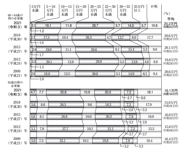 この数値を見ると、65歳になるまでは約20万円~25万円が必要だと思っている人の割合が多く、65歳を過ぎると15万円~20万円未満と答えている割合が多くなっていることに気付かされます。