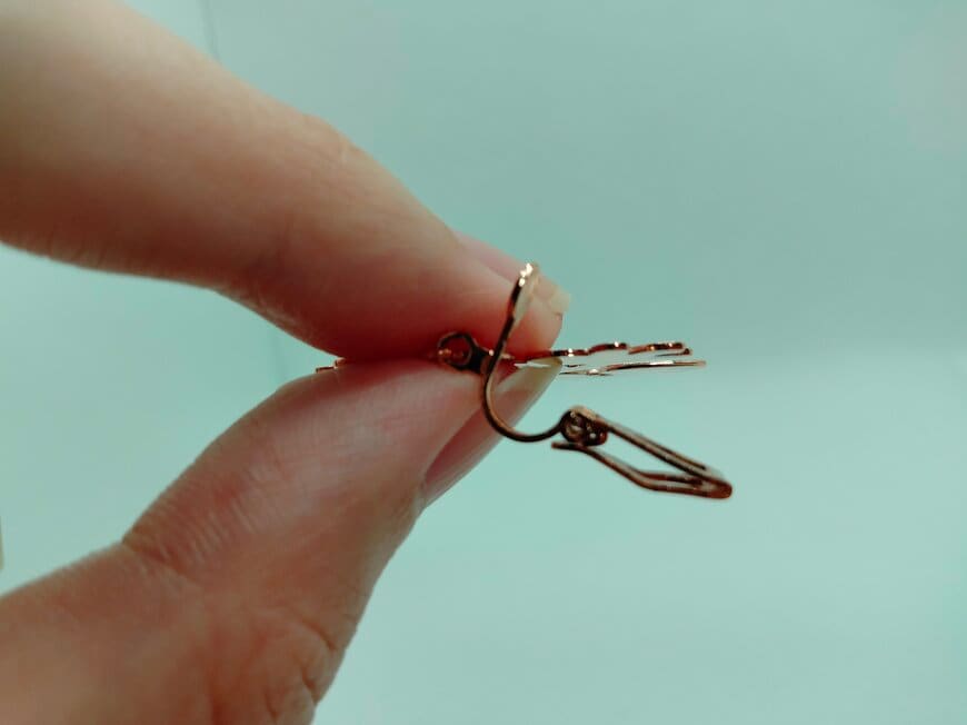 画像のようにクリップタイプのイヤリングとなっています。大き目の面で支えることができるので、普段はあまりイヤリングをつけない方でも痛みを感じにくいです。
