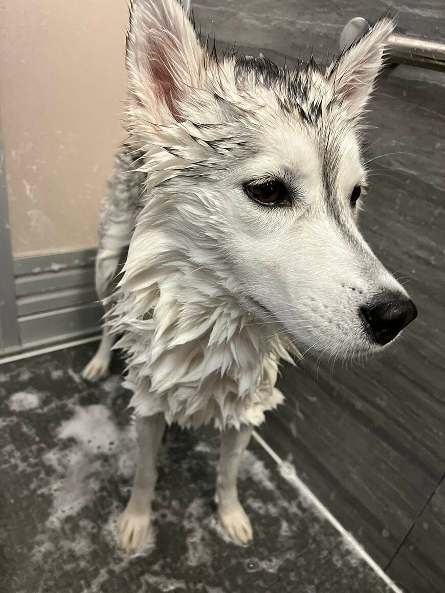 ペットの中にはシャンプー中に暴れてしまう子もいますが、このハスキー犬は無表情で一点を見つめているようです。