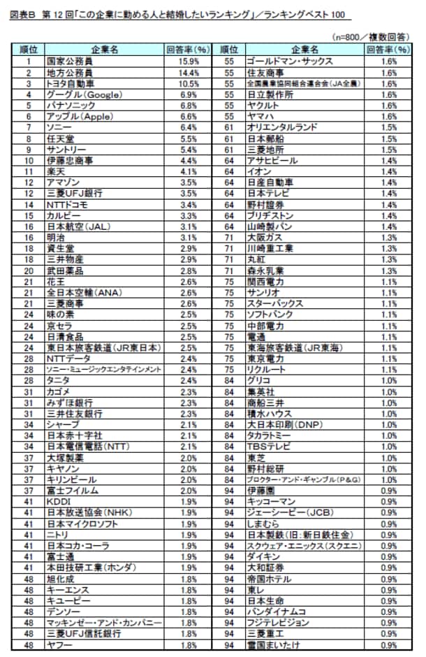 また女性が結婚相手の男性に望む勤務先の1位は「国家公務員」(回答率20.0%)、2位「地方公務員」(同15.8%)、3位「トヨタ自動車」(同10.3%)、4位「パナソニック」(同9.3%)、5位「アップル(Apple)」(同8.8%)となっています。