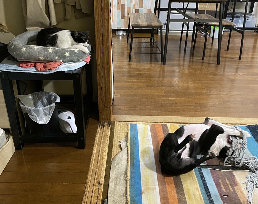 「犬がひっくり返って遊んでるのを眺める猫をどうぞ。」というツイートともに投稿されたのは、犬と猫の写った1枚の写真です。