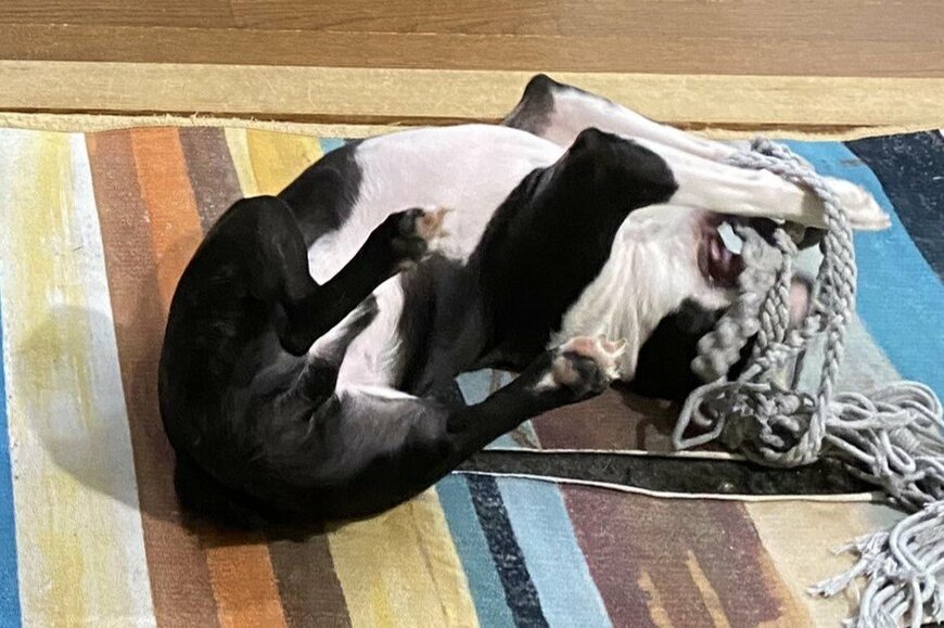 犬は、網のようなものに絡まりながら、ひっくり返って遊んでいます。