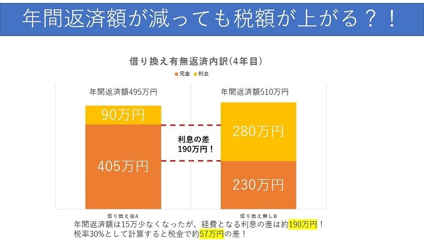 利息(経費)の差額が約190万となりますので、税率30%で計算すると、税金で約57万円の差になります。