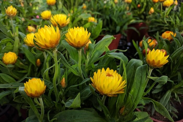 カサカサとした質感の花弁がユニークなヘリクリサム。色も豊富でイエローやオレンジ、レッドの花色がそろいます。開花期は10月まで。長く庭を彩ります。