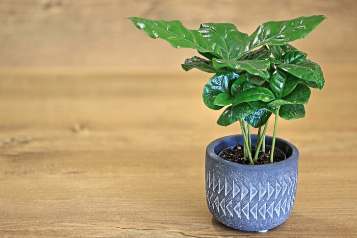 つややかな葉がオシャレなコーヒーの木。100均でも観葉植物として出回っています。大きく育つと花が咲き、実をつけることも。