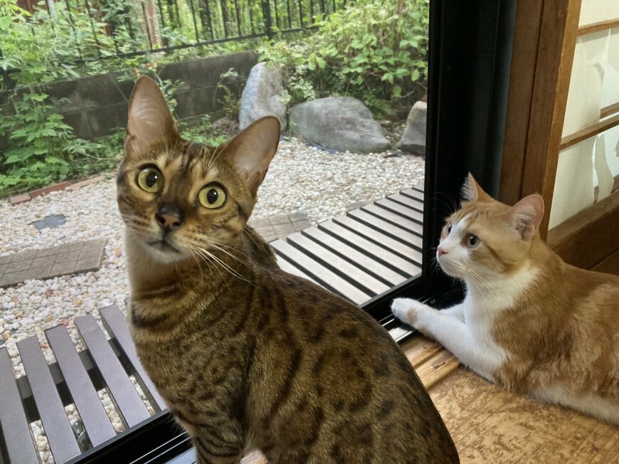 風流な庭に面した窓際で、2匹の猫がくつろいでいます。