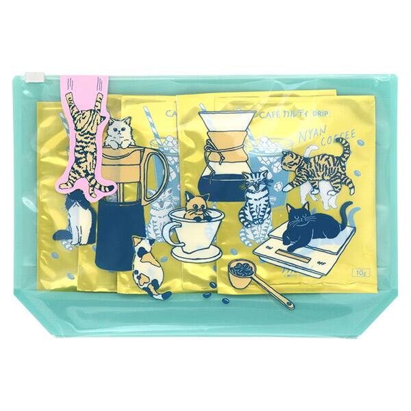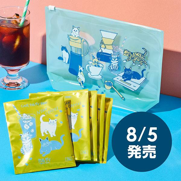 毎年大好評のニャンコーヒードリップセット。今年も新デザインで登場します。両面にねこのイラストが入ったジッパー付きバッグと、ニャンコーヒードリップ5個入で税込み800円というお得なセット。